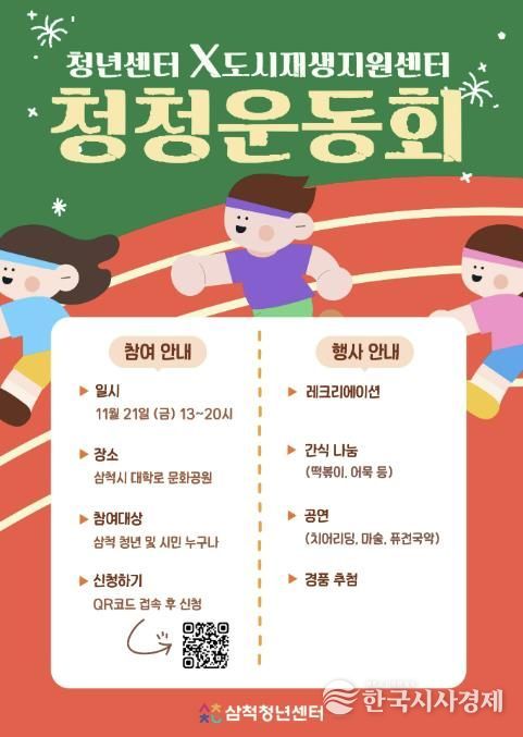 한국시사경제 이정이 기자 | 삼척청년센터는 오는 11월 21일 오후 1시, 삼척 대학로 문화공원에서 ‘2025 삼척청년센터와 함께하는 청춘청년 운동회’를 개최한다.