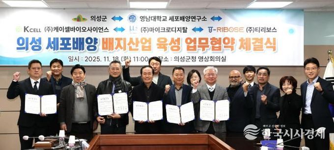 한국시사경제 이정이 기자 | 의성군은 11월 18일 영남대학교 세포배양연구소(소장 최인호), ㈜케이셀바이오사이언스(대표 강기용), ㈜마이크로디지탈(대표 김경남), ㈜티리보스(대표 윤형호)와 함께 세포배양 배지 산업 육성을 위한 5자 업무협약(MOU)을 체결했다.