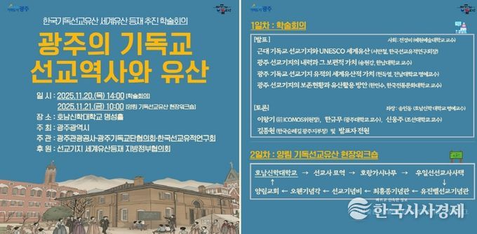 광주광역시는 20~21일 호남신학대학교 일원에서 ‘한국기독선교유산 세계유산 등재 추진을 위한 학술회의와 워크숍’을 열어 한국 근대 기독교 선교의 역사적 가치를 조명한다.