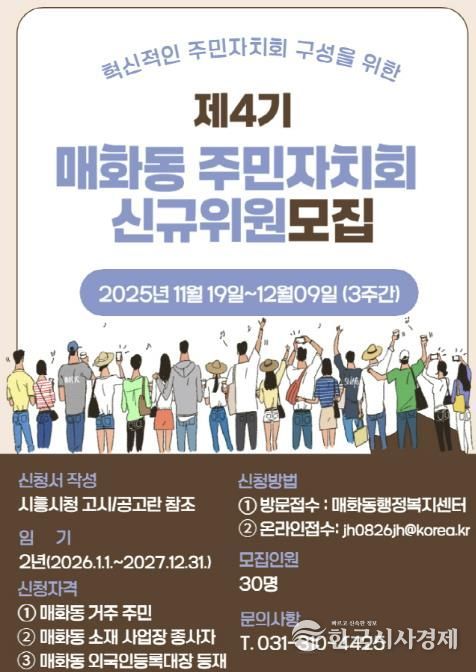 한국시사경제 경기취재본부 | 시흥시 매화동 행정복지센터는 12월 9일까지 ‘제4기 매화동 주민자치회’ 신규위원 30명을 공개 모집한다. 신청은 매화동 행정복지센터 방문 또는 전자우편을 통해 가능하다.