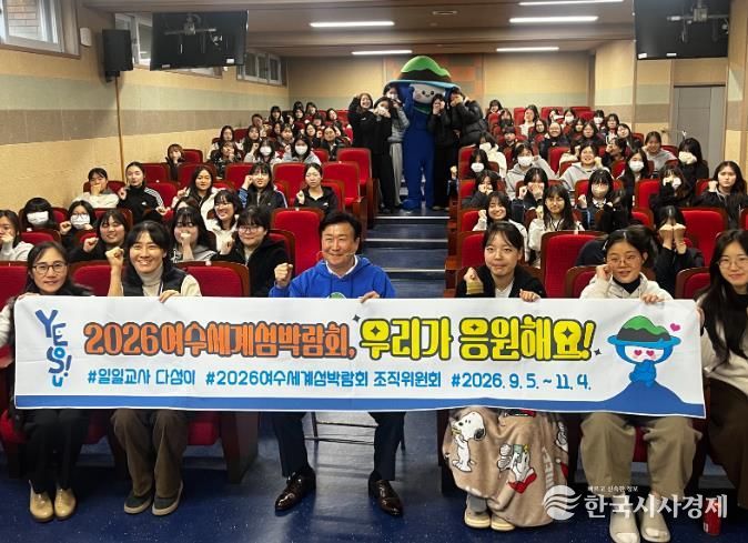 한국시사경제 전남취재본부 | (재)2026여수세계섬박람회 조직위원장 정기명 여수시장이 섬박람회를 알리기 위해 여수 중앙여자고등학교에 일일교사 다섬이로 나섰다.