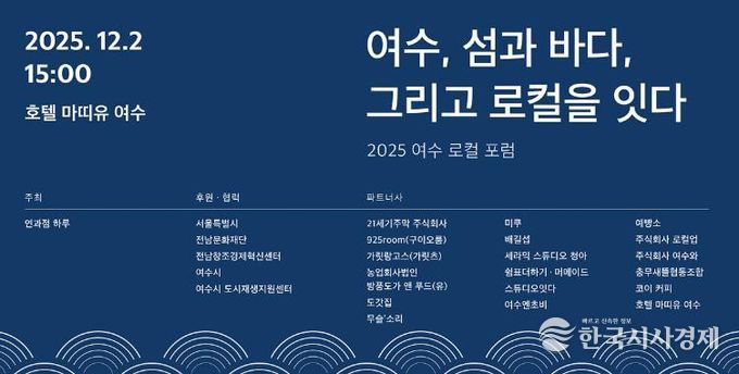 한국시사경제 전남취재본부 | 여수시는 ‘연과점 하루’가 오는 12월 2일 오후 3시 마띠유호텔에서 ‘여수, 섬과 바다, 그리고 로컬을 잇다 - 2025 여수 로컬 포럼’을 개최한다고 밝혔다.