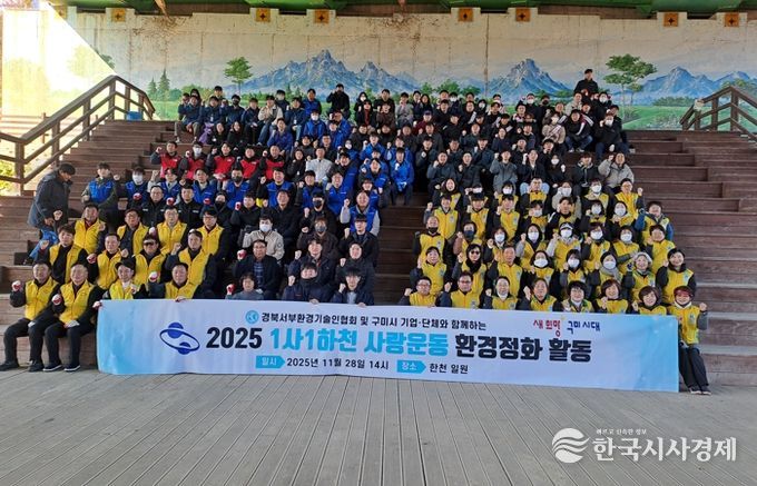 한국시사경제 경북취재본부 | 구미시는 지난 28일 양포동 한천 일원에서 ‘2025년 1사1하천 사랑운동’의 일환으로 하천정화활동을 실시했다. 이번 활동에는 구미시가 주관하고 경북서부환경기술인협회 등 27개 기업과 민간단체 임직원 및 회원 등 160여 명이 참여했다.