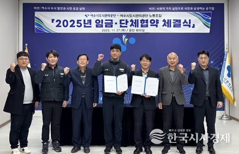 한국시사경제 전남취재본부 | 여수시도시관리공단은 올해 9월 단체협약 체결에 이어, 지난 27일 공단 회의실에서 교섭대표 노동조합과 ‘2025년 임금협약’ 체결식을 개최했다.
