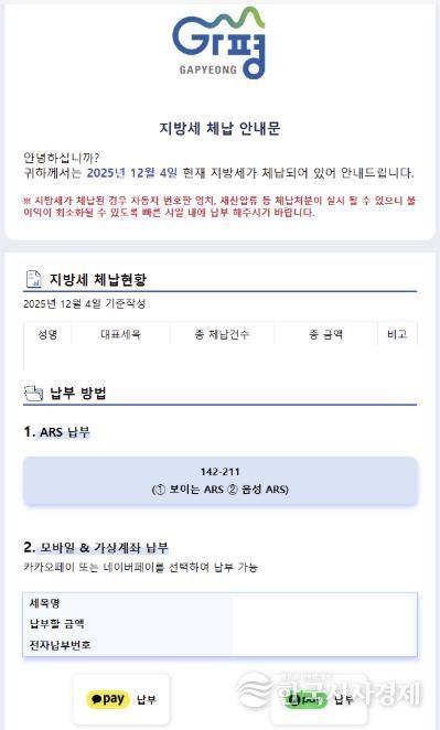 한국시사경제 경기북부취재본부 | 가평군이 지방세 체납액 징수 강화를 위해 최근 체납자 4,790명에게 총 44억 원 규모의 지방세 체납안내문을 카카오톡 모바일 전자고지로 일제히 발송했다.