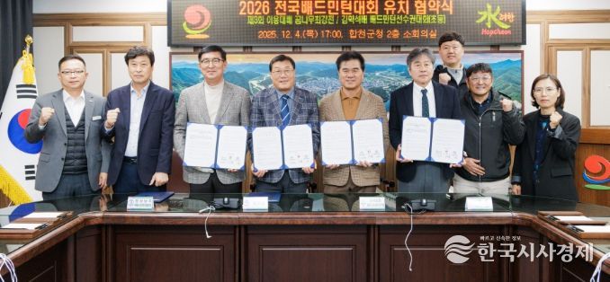 한국시사경제 노승선 기자 | 합천군은 12월 4일 합천군청에서 ‘제3회 이용대배 꿈나무 최강전’과 ‘2026 김학석배 전국 종별 배드민턴선수권대회(초등)’ 총 2건의 전국규모 배드민턴대회 유치 협약을 체결했다고 밝혔다.