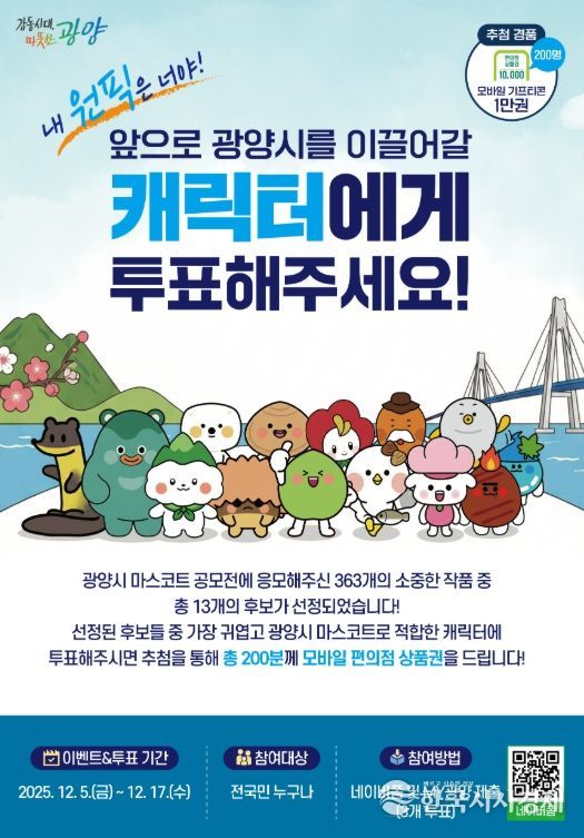 한국시사경제 권충언 기자 | 광양시는 앞으로 시의 정체성과 이미지를 대표할 새로운 캐릭터 선정을 위해 12월 5일부터 17일까지 선호도 투표를 진행한다고 5일 밝혔다.