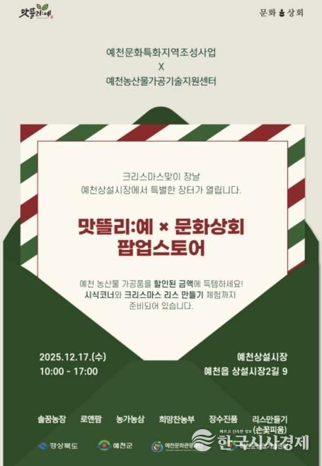 한국시사경제 권충언 기자 | 예천군과 예천문화관광재단은 17일, 예천상설시장 ‘문화상회’에서 크리스마스를 맞아 ‘문화상회 X 맛뜰리:예’ 프로그램을 개최한다.