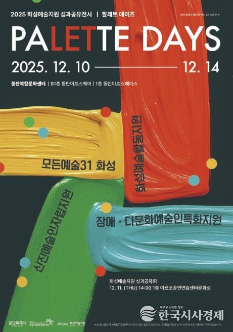 한국시사경제 이정이 기자 | (재)화성시문화관광재단은 12월 10일부터 14일까지 동탄복합문화센터(동탄아트스퀘어·동탄아트스페이스·아르코공연연습센터 화성)에서 ‘2025 화성예술지원 성과공유 주간 'Palette Days'’ 행사를 진행한다.