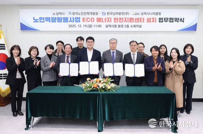 한국시사경제 문화팀 | 삼척시는 12월 19일 한국노인인력개발원, 한국남부발전(주) 삼척빛드림본부, 삼척시니어클럽과 함께 신규 어르신 일자리 창출사업으로 ‘Eco에너지 안전지원센터’ 운영을 위한 업무협약을 체결했다.