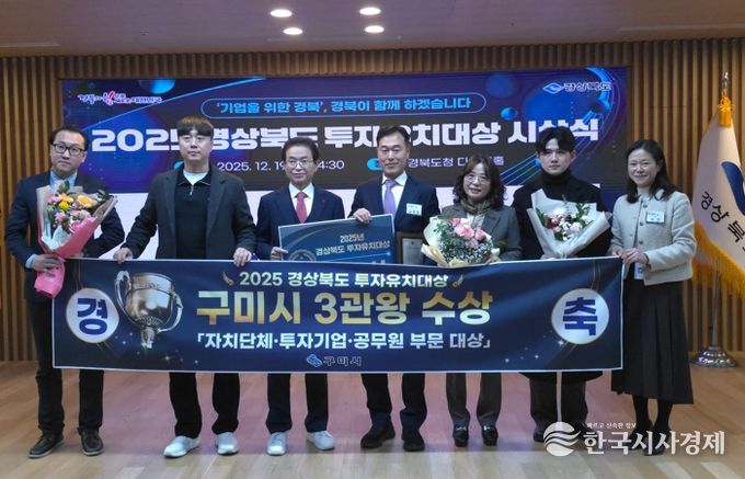 한국시사경제 경북취재본부 | 구미시는 지난 19일 경북도청 다목적홀에서 열린 '2025년 경상북도 투자유치 대상' 시상식에서 지자체 부문, 기업 부문, 유공 공무원 부문 모두에서 대상을 수상하며 ‘트리플크라운(3관왕)’을 달성했다. 경상북도 내 시·군의 투자유치 실적과 투자 활성화 노력 등을 종합 평가한 결과로, 구미시는 어려운 대외 여건 속에서도 2024년에 이어 2년 연속 최고 영예를 안았다.