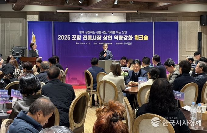 한국시사경제 노승선 기자 | 포항시는 지난 19일 포마레웨딩컨벤션에서 서재원 포항시 정무특보, 임주희 포항시의회 경제산업위원장을 비롯해 지역 전통시장 상인회 임원 등 관계자 100여 명이 참석한 가운데 2025년 ‘포항시 전통시장 상인 역량강화 워크숍’을 개최했다.