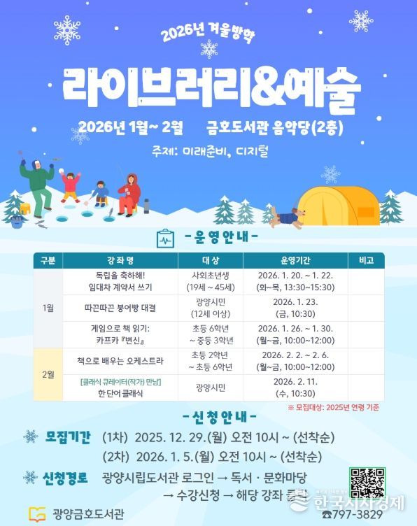 한국시사경제 권충언 기자 | 광양금호도서관이 2026년 겨울방학 프로그램 ‘라이브러리·예술’ 수강생을 모집한다.