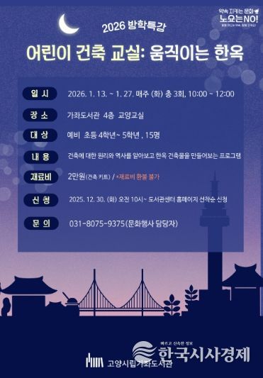 한국시사경제 윤광희 기자 | 고양특례시 가좌도서관은 2026년 1월 13일부터 27일까지 매주 화요일 3회차에 걸쳐 방학특강 프로그램 ‘어린이 건축 교실: 움직이는 한옥’을 운영한다고 밝혔다.