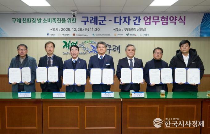 한국시사경제 권충언 기자 | 구례군은 친환경 농업의 가치를 확산하고 쌀 소비 기반을 강화하기 위해 공공·금융·농협·민간이 참여하는 다자간 업무협약을 지난 12월 26일 군청 상황실에서 체결했다.