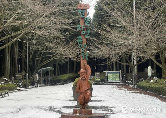 한국시사경제 사회팀 | 제주시 절물생태관리소는 겨울철 눈 덮인 절물자연휴양림의 비경을 즐기는 탐방객이 늘어남에 따라 안전사고 예방을 위해 ‘겨울철 탐방 5대 수칙’을 안내하고 있다.
