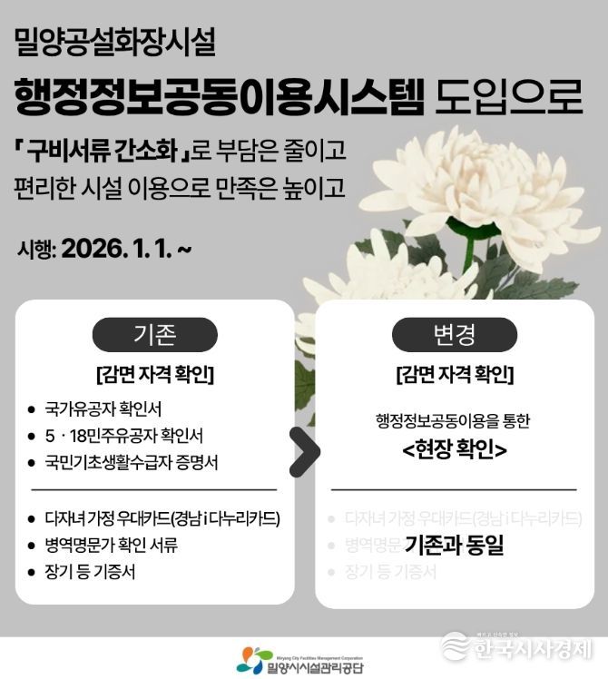 한국시사경제 노승선 기자 | 밀양시시설관리공단은 밀양공설화장시설을 이용하는 유가족의 편의를 높이기 위해 구비서류를 간소화하는 ‘행정정보 공동이용 시스템’을 오는 1월 1일부터 시행한다.