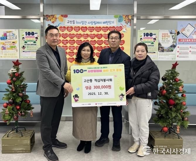 한국시사경제 경기북부취재본부 | 의정부시 고산동주민센터는 12월 30일 고산동 적십자봉사회가 성금 30만 원을 기부하며 ‘100일간 사랑릴레이 배턴 잇기’에 동참했다고 밝혔다.
