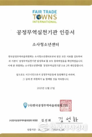 한국시사경제 경기취재본부 | 부천여성청소년재단이 운영하는 소사청소년센터는 지난달 27일 사단법인 한국공정무역마을위원회로부터 ‘공정무역 실천기관’ 2차 재인증을 획득했다.
