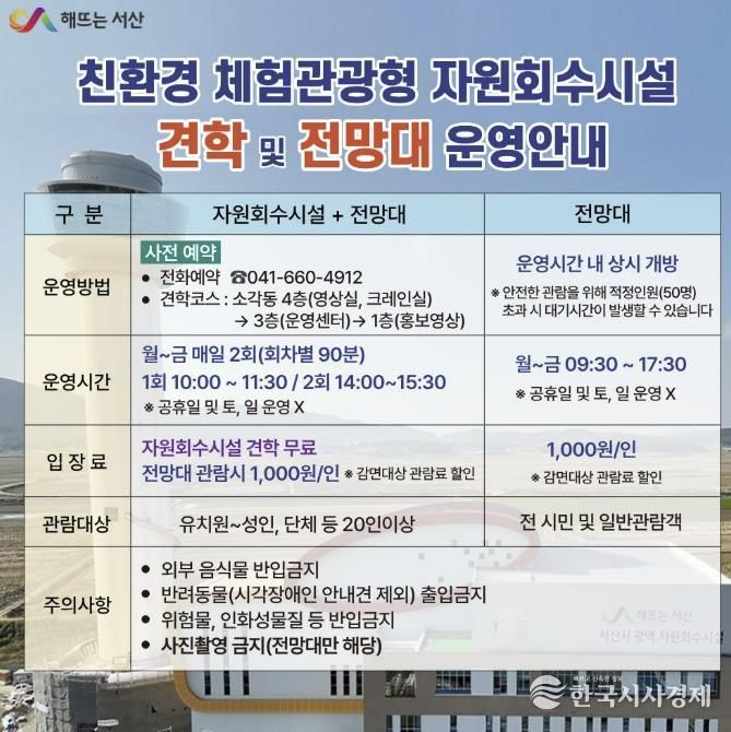 한국시사경제 충남취재본부 | 충남 서산시는 지난 2일부터 친환경 체험관광형 자원회수시설 전망대를 본격 운영 중이라고 밝혔다.
