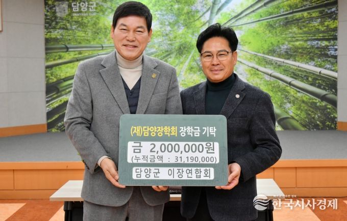 담양군 12개 읍·면 이장들로 구성된 담양군 이장연합회는 지역사회와 상생하는 나눔을 실천하고자 지난 2009년부터 현재까지 3,100만 원의 장학금을 꾸준히 기탁해 오고 있으며, 올해도 새해의 시작과 함께 담양군의 발전과 미래 인재 양성을 기원하는 마음을 한데 모아 장학금을 마련했다.