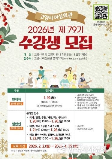 한국시사경제 권충현 기자 | 고양특례시 여성회관은 오는 1월 19일부터 26일까지 2026년도 제79기 정규강좌 수강생을 모집한다고 밝혔다.