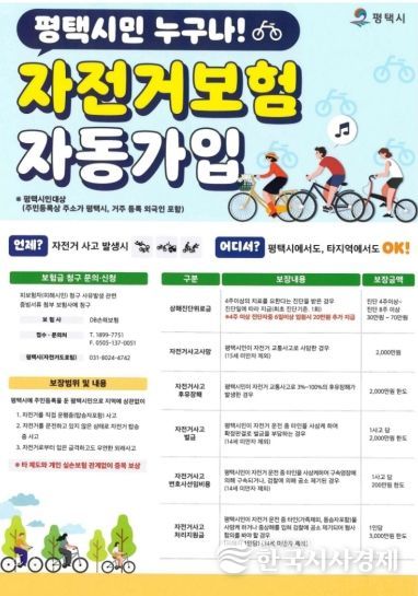 평택시 자전거 보험은 평택시에 주민등록이 되어 있는 시민이라면 별도의 가입 절차 없이 자동으로 가입되며, 자전거 사고로 인한 사망·후유장해, 진단위로금, 벌금, 변호사 선임 비용 등을 보장한다.
