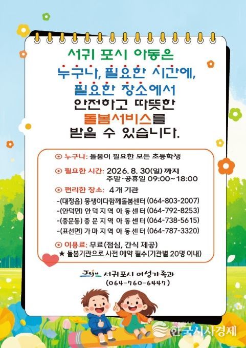 한국시사경제 문화팀 | 서귀포시는 2026년 아동 틈새돌봄 시범사업을 연장 운영(2026년 1월 ~ 8월)한다고 밝혔다.