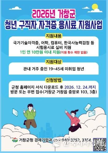 한국시사경제 경남취재본부 | 거창군은 미취업 청년의 취업 역량 강화와 경제적 부담 완화를 위해 각종 자격증 시험 응시료를 지원한다.