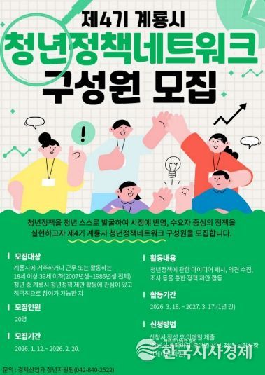 한국시사경제 김태훈 기자 | 충남 계룡시는 이달 12일부터 오는 2월 20일까지 제4기 청년정책네트워크에 참여할 지역 청년을 모집한다.