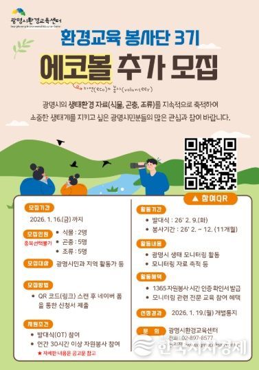 한국시사경제 경기취재본부 | 광명시는 지역 생태환경을 직접 조사하고 기록할 시민 참여형 모니터링 봉사단 ‘에코볼 3기’를 오는 16일까지 추가 모집한다.