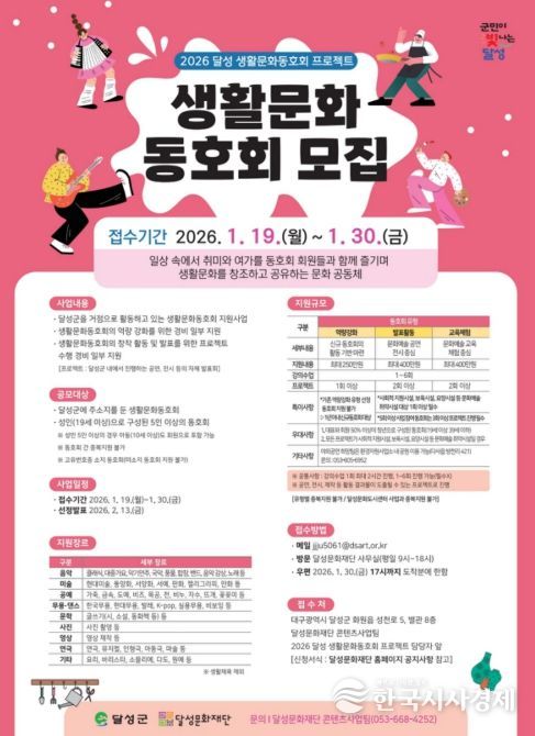 한국시사경제 대구취재본부 | (재)달성문화재단은 1월 19일부터 30일까지 ‘2026 달성 생활문화동호회 프로젝트’에 참여할 동호회를 모집한다고 9일 밝혔다.