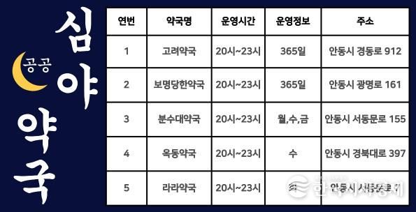 한국시사경제 경북취재본부 | 안동시는 시민의 의약품 접근성을 높이고 심야 시간대 의료 공백을 해소하기 위해 1월 1일부터 공공심야약국을 기존 2개소에서 5개소로 확대 지정해 운영 중이다.