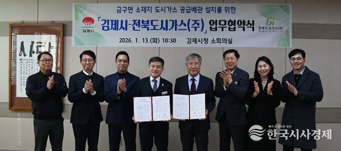한국시사경제 김숙영 기자 | 김제시는 전북도시가스 주식회사(대표 김홍식)와 13일 시청 소회의실에서 금구면 주민들의 에너지복지 향상을 위해 도시가스 공급배관 설치사업 업무협약을 체결했다고 밝혔다.