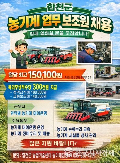한국시사경제 노승선 기자 | 합천군은 농기계대여은행 운영체계를 강화하고 농업인 영농 편의를 높이기 위해 2026년 농기계 업무보조원 기간제근로자 9명을 채용한다고 14일 밝혔다.