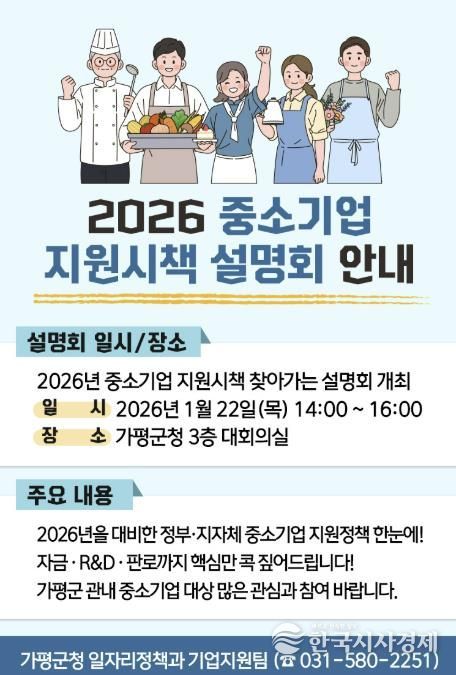 가평군은 관내 중소기업을 대상으로 ‘2026년 중소기업 지원시책 설명회’를 오는 22일 오후 2시 가평군청 3층 대회의실에서 개최한다고 밝혔다. 이번 설명회는 2026년도 중소기업 지원정책을 종합적으로 소개하는 한편 기업 현장의 애로사항을 직접 청취해 정책 수요에 반영하기 위해 마련됐다. 설명회에는 중소벤처기업진흥공단, 기술보증기금, 소상공인진흥공단, 경기중소벤처기업청 등 10개 기관이 참여한다.