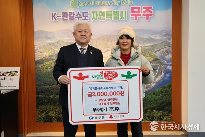 한국시사경제 김숙영 기자 | 무주군 무주읍에 위치한 한식 전문점 ‘무주명가’의 김민주 사장이 지난 14일 무주군에 이웃돕기 성금 1백만 원, (재)무주군교육발전장학재단에 장학금 1백만 원 등 총 2백만 원을 기탁했다.