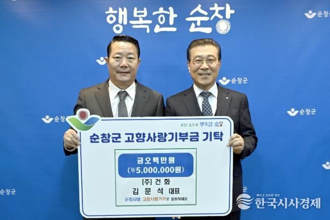 한국시사경제 전북취재본부 | 순창군은 15일 ㈜건화 김문석 대표이사가 순창군에 고향사랑기부금 500만원을 기탁했다고 밝혔다.