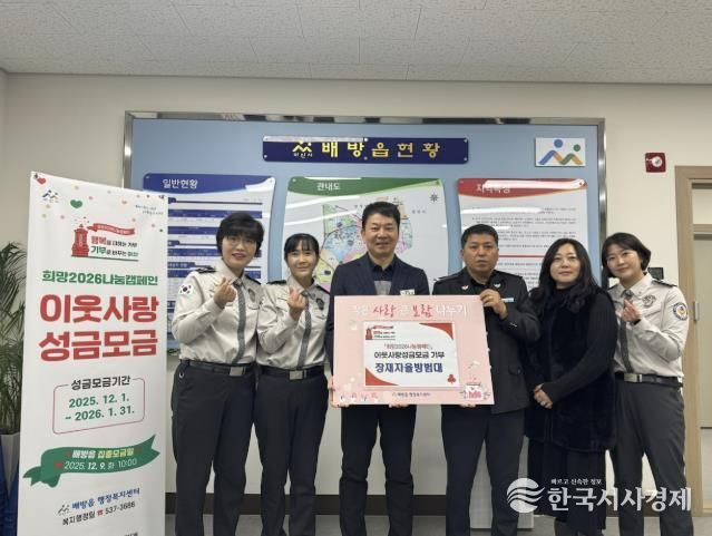 한국시사경제 충남취재본부 | 배방읍 장재자율방범대는 지난 15일 배방읍 행정복지센터에서 지역 내 어려운 이웃을 돕기 위한 ‘희망2026 나눔캠페인’에 동참해 성금 100만 원을 전달했다.