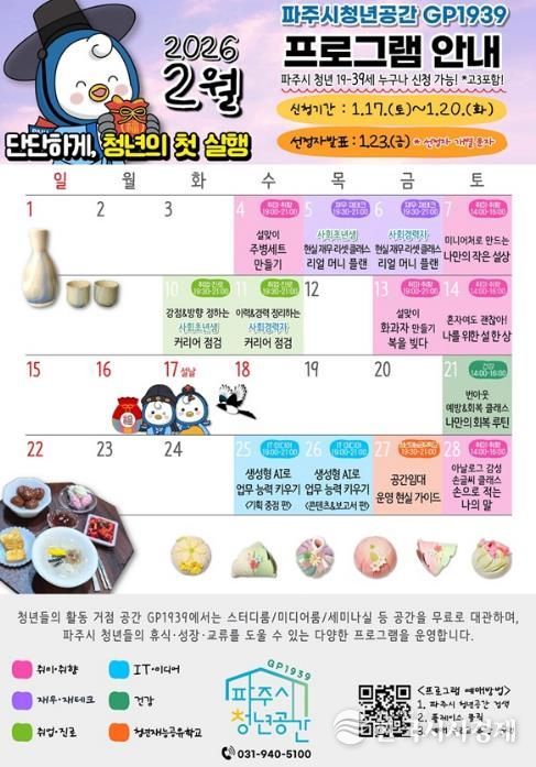 한국시사경제 경기북부취재본부 | 파주시청년공간 지피(GP)1939가 오는 2월 한 달간 청년을 위한 맞춤형 프로그램에 참여할 참여자를 모집한다.