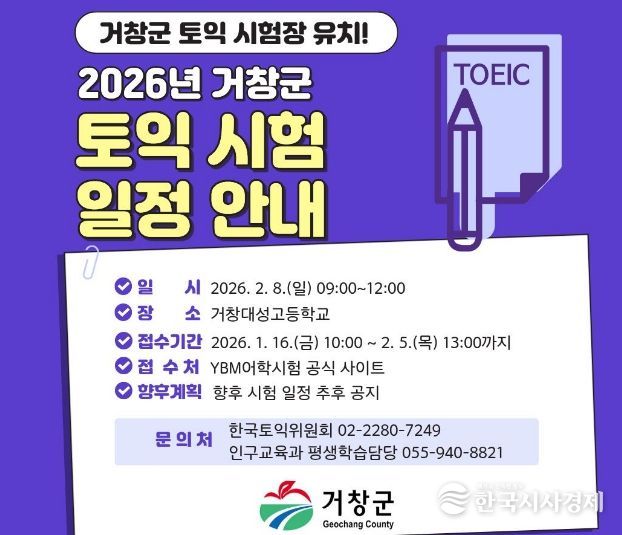 거창군 관계자는 “토익시험장 유치는 교육도시 거창의 이미지를 강화하는 동시에, 생활인구 확대라는 정책 목표를 함께 달성할 수 있는 의미 있는 사업”이라며 “앞으로도 군민의 학습 편의를 높이고, 외부 인구가 찾는 교육 환경 조성에 지속해서 힘쓰겠다”고 말했다.