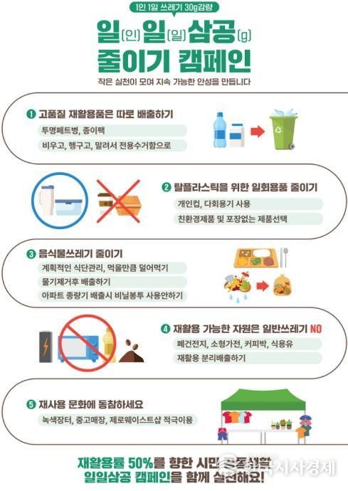 한국시사경제 경기취재본부 | 안성시는 시민의 자발적인 실천을 통해 재활용률을 높이고 생활쓰레기 발생량을 줄이기 위한 ‘1인 1일 쓰레기 30그램 줄이기(일일삼공) 캠페인’을 적극 추진하고 있다고 밝혔다.