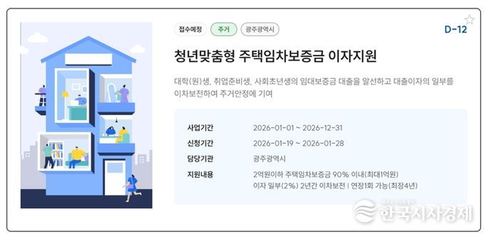 한국시사경제 광주취재본부 | 광주광역시는 무주택 청년의 주거비 부담 완화를 위한 청년맞춤형 주택임차보증금 이자지원 사업 대상자를 19일부터 모집한다.