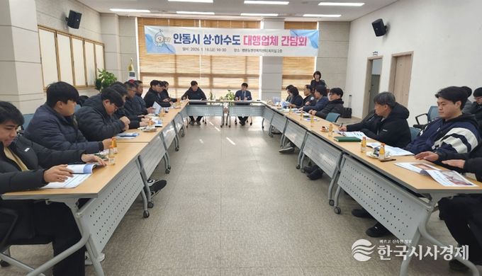 한국시사경제 경북취재본부 | 안동시는 1월 16일 명륜동행정복지센터 2층 회의실에서 상․하수도 대행업체 10개 사 대표와 시청 직원 등 30여 명이 참석한 가운데, 대행사업 품질 향상 및 상호 협력 강화를 위한 ‘상하수도 대행업체 간담회’를 개최했다.