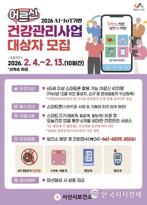 한국시사경제 충남취재본부 | 충남 서산시가 인공지능(AI)·사물인터넷(IOT) 기반 어르신 건강관리사업의 대상자를 모집한다고 밝혔다.
