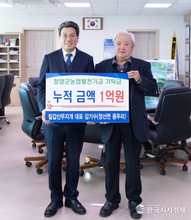한국시사경제 충남취재본부 | 청양군은 정산면 용두리 소재 ‘칠갑산무지개’의 김기수 대표가 군청을 방문해 농업발전기금 1,000만 원을 기탁하면서 올해로 마침내 누적 기탁금 1억 원을 달성했다고 밝혔다.