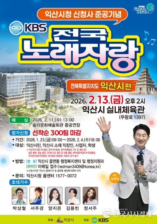 시 관계자는 "신청사 준공은 익산의 미래를 여는 상징적인 순간"이라며 "전국노래자랑을 통해 시민과 함께 신청사 개청을 축하하고, 익산의 밝은 에너지를 전국에 전하겠다"고 말했다.