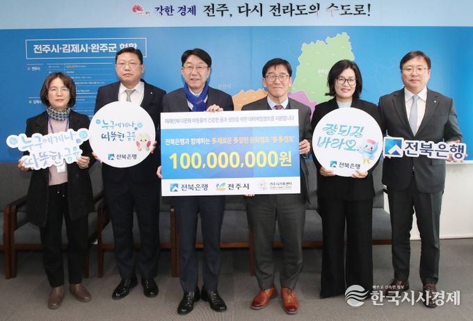 이 자리에서 전북은행은 전주시에 캠프 운영을 위한 총 1억 원의 성금을 전달했다.