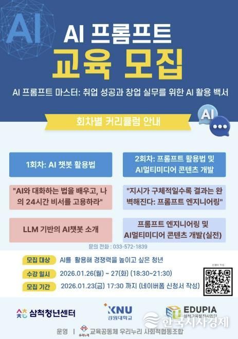 한국시사경제 권충언 기자 | 삼척청년센터는 삼척교육발전사업단(EDUPIA)와 함께 AI 기술을 활용한 취업·창업 실무 역량 강화를 위해 ‘AI 프롬프트 교육과정’을 개설하고 참여자를 모집한다.