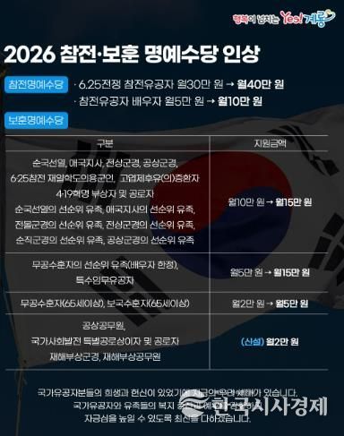 주요 인상 내용으로는 참전명예수당의 경우 ▲6·25참전유공자에게 월 10만 원을 추가 지급하고 ▲참전유공자 배우자 복지수당을 월 5만 원에서 월 10만 원으로 인상했다.